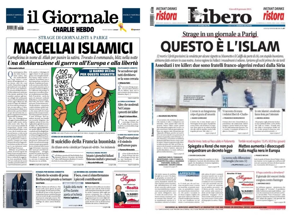Le prime pagine de il Giornale e Libero del 8 gennaio 2015