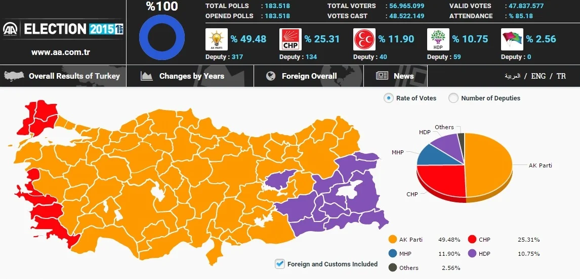 Nelle elezioni politiche del 7 giugno scorso il partito di Erdogan, l’Akp, aveva evidenziato una significativa crisi, scendendo al 40.86% dei consensi (18,8 mln di voti), insufficienti non soltanto per riscrivere la Costituzione in senso presidenzialista, ma anche per formare un governo monocolore (l’unico governo che Erdogan concepisca). Nelle elezioni di ieri 1 novembre, invece, l’Akp ha ottenuto il 49,4% (23,7 mln di voti), che gli consegna un’ampia maggioranza assoluta in parlamento, sufficiente a formare un governo monocolore, anche se manca ancora un pugno di parlamentari per le riforme autoritarie.