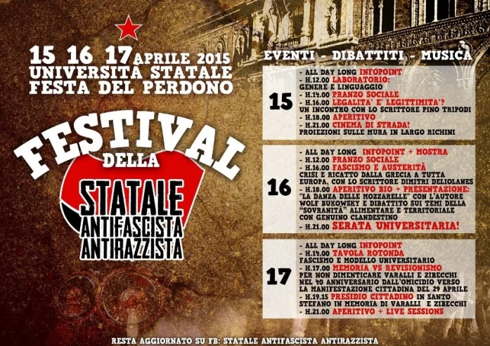 15-16-17 aprile - Festival della Statale Antifascista e Antirazzista in Università Statale, via Festa del Perdono. Per il programma dettagliato vedi l’evento fb.