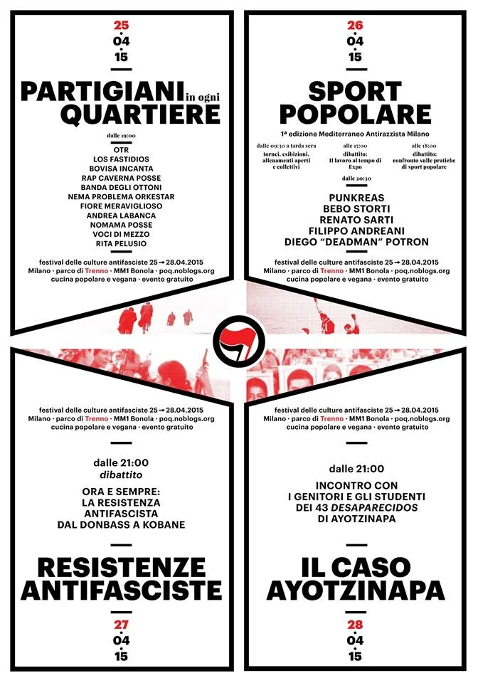 25-26-27-28 aprile - Festival delle culture antifasciste al parco di Trenno (MM1 Bonola). Per info e il programma dettagliato vai su http://poq.noblogs.org/