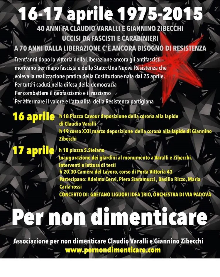 16-17-18 aprile - Iniziative in occasione del 40° anniversario degli omicidi di Claudio Varalli e Giannino Zibecchi. Per info e dettagli vedi il nostro post.