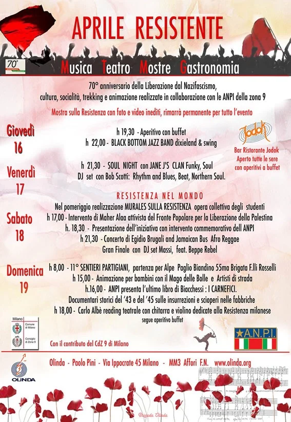 16-17-18-19 aprile - Olinda e l'Anpi di zona 9 organizzano Aprile Resistente. Le iniziative si tengono in via Ippocrate 45. Inoltre, domenica mattina c'è l'escursione dei Sentieri Partigiani.