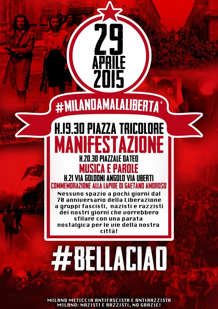 Questo aprile non è un aprile qualsiasi. È il 70° anniversario della Liberazione dal nazifascismo e in troppi vorrebbero ridurlo a mera commemorazione storica, come se si trattasse della battaglia di Marignano e non invece dell’atto costituente della Repubblica laica e della libertà di cui (ancora) tutti quanti godiamo. Una libertà che non ci fu regalata, ma conquistata a caro prezzo, grazie al sacrificio dei tanti e delle tante giovani che allora scelsero e fecero la Resistenza, in montagna e in città. È una libertà che non è data una volta per tutte, ma che va difesa e riconquistata giorno per giorno. Per questo, specie di questi tempi di tentazioni autoritarie e rigurgiti fascisti e razzisti, va riaffermata l’attualità e l’imprescindibilità dell’antifascismo. Eccovi dunque un piccolo calendario ragionato delle iniziative antifasciste che si terranno a Milano da qui a fine aprile e che ricordano il passato per guardare al presente e al futuro.